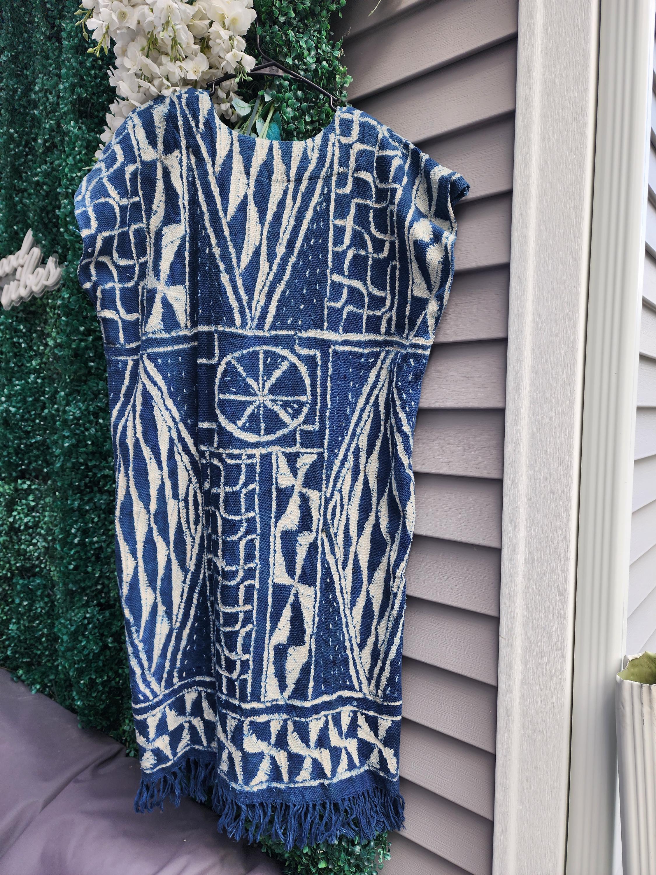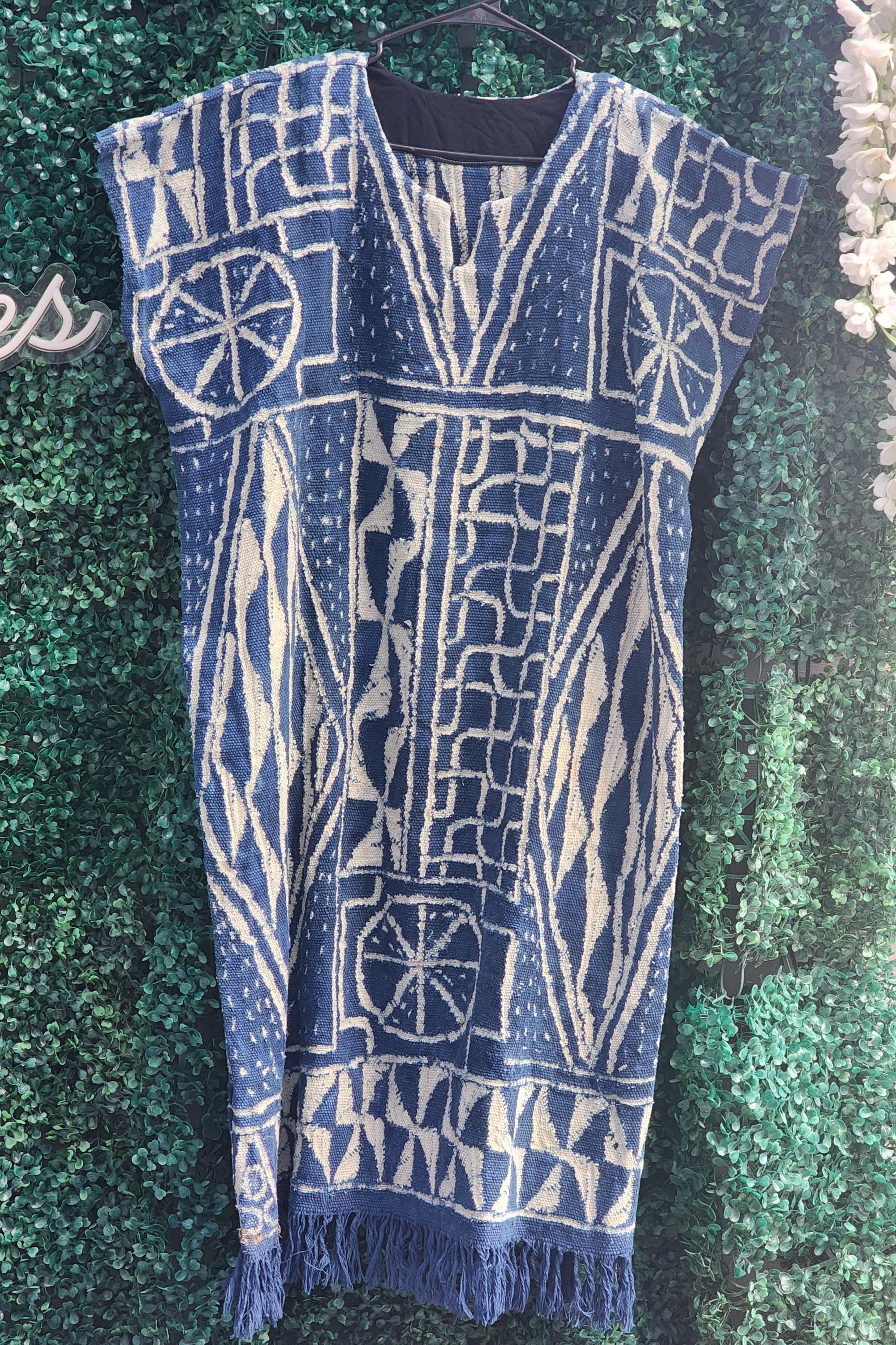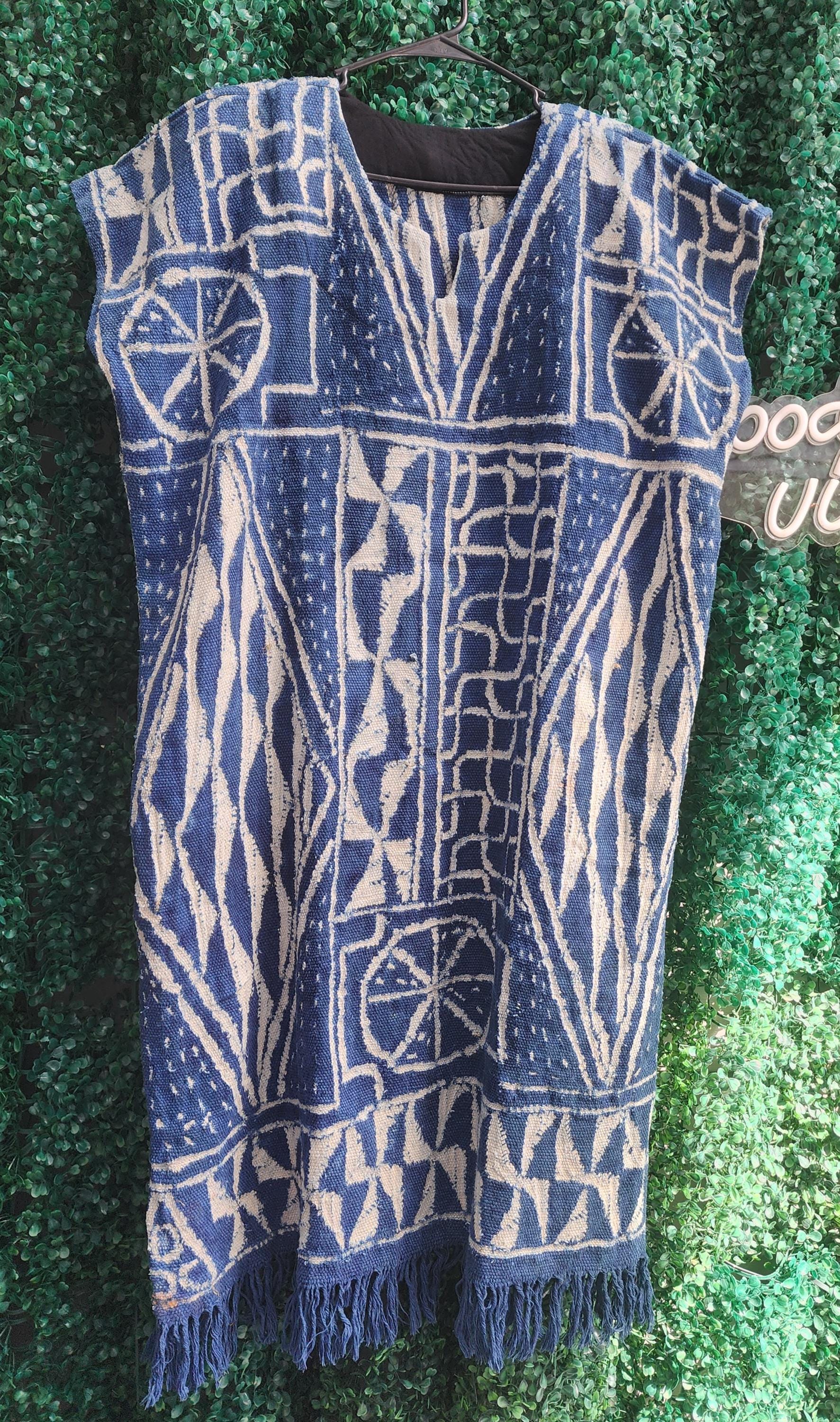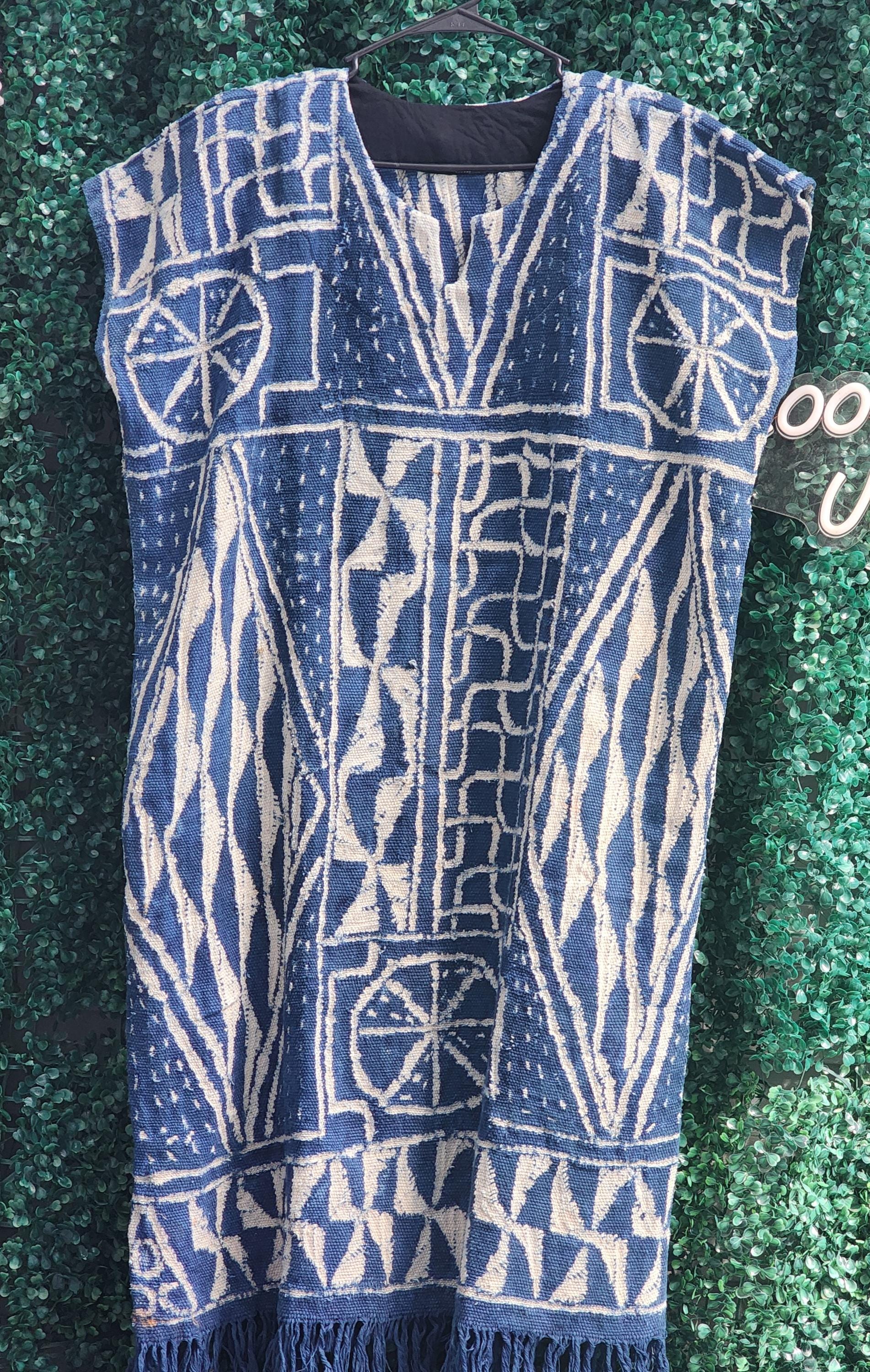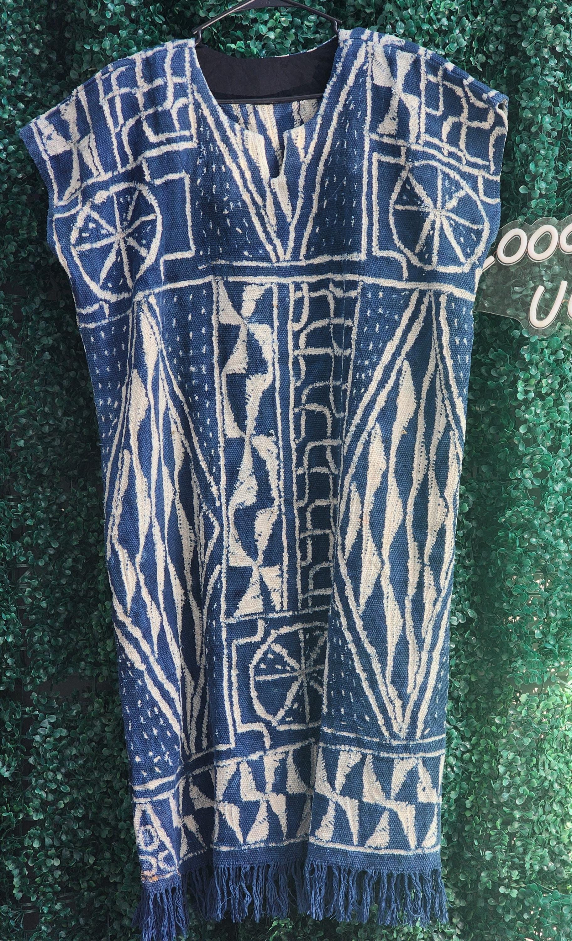 A magnificent traditional African dress.A beautiful African dress in original Ndop fabric from Bamilekes Cameroon.not very long It measures 47inches or 120cm long including fringes.it slightly exceeds the knees.a style for lovers of tradition,