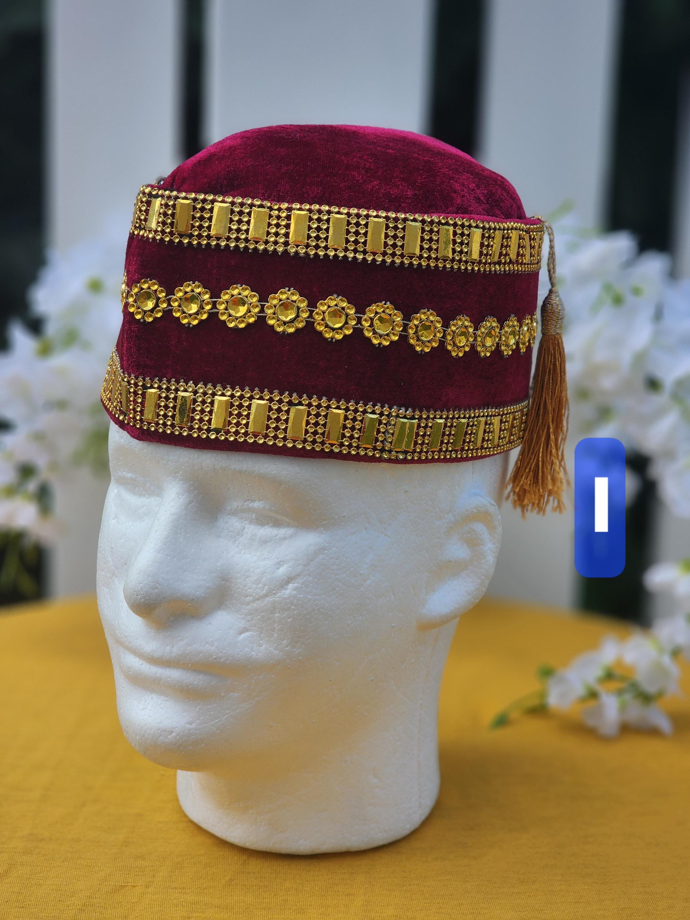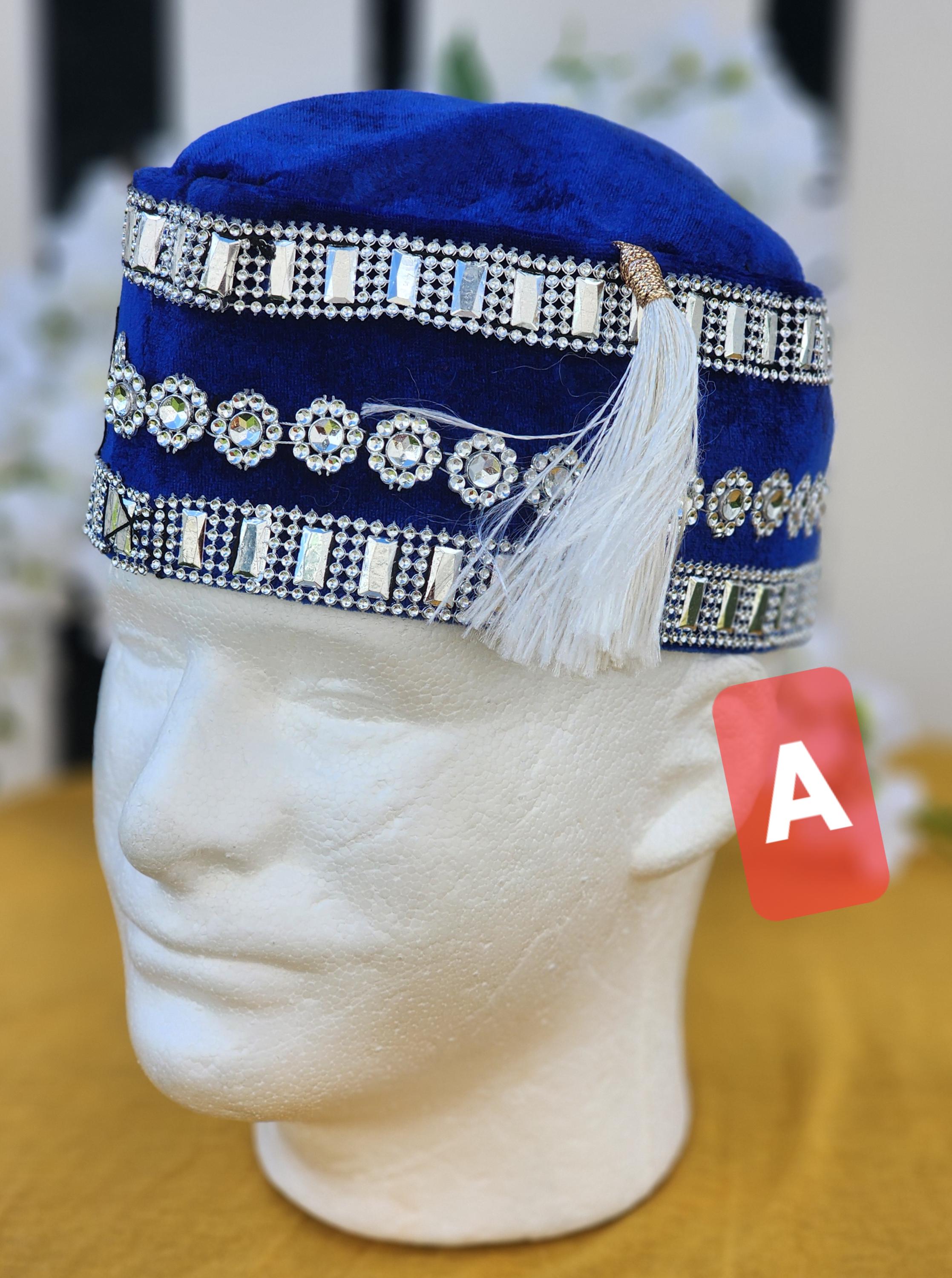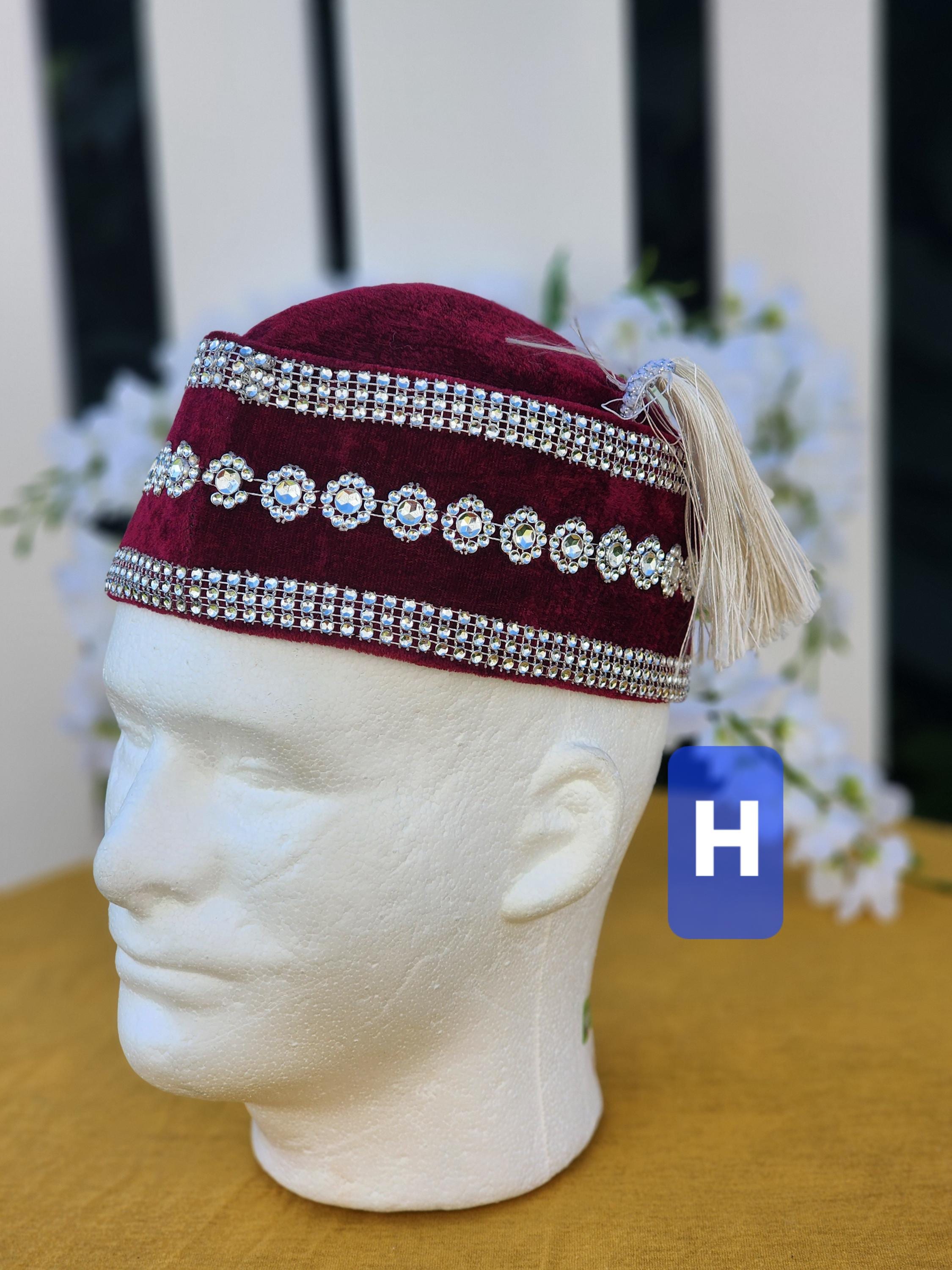 these hats are made with velvet fabric and decorated .They are perfect for traditional weddings.
