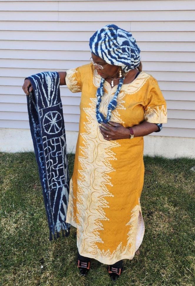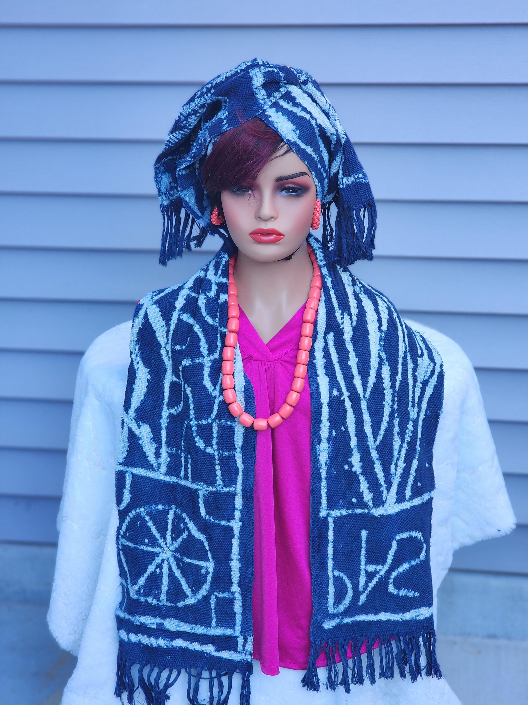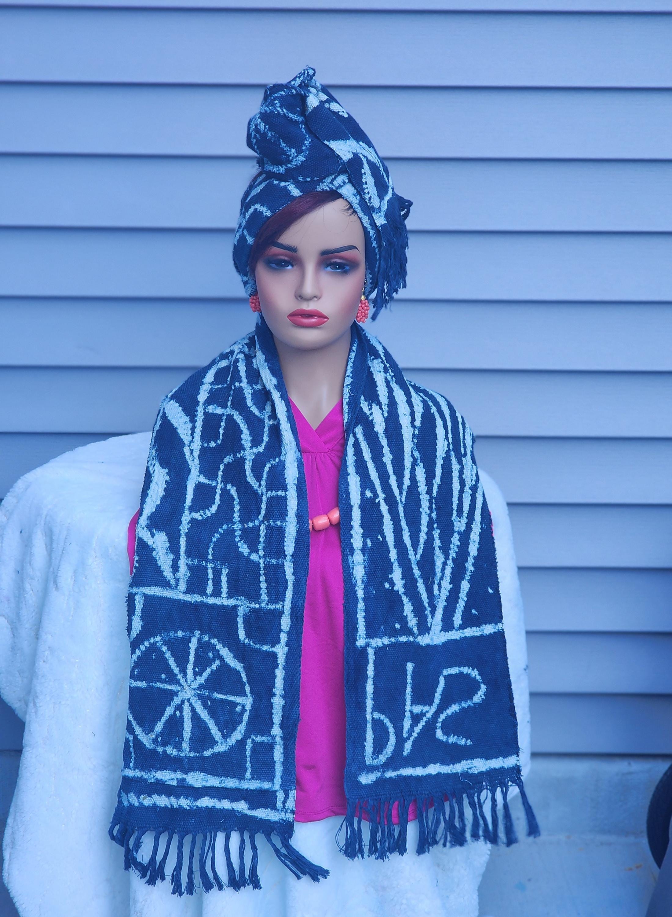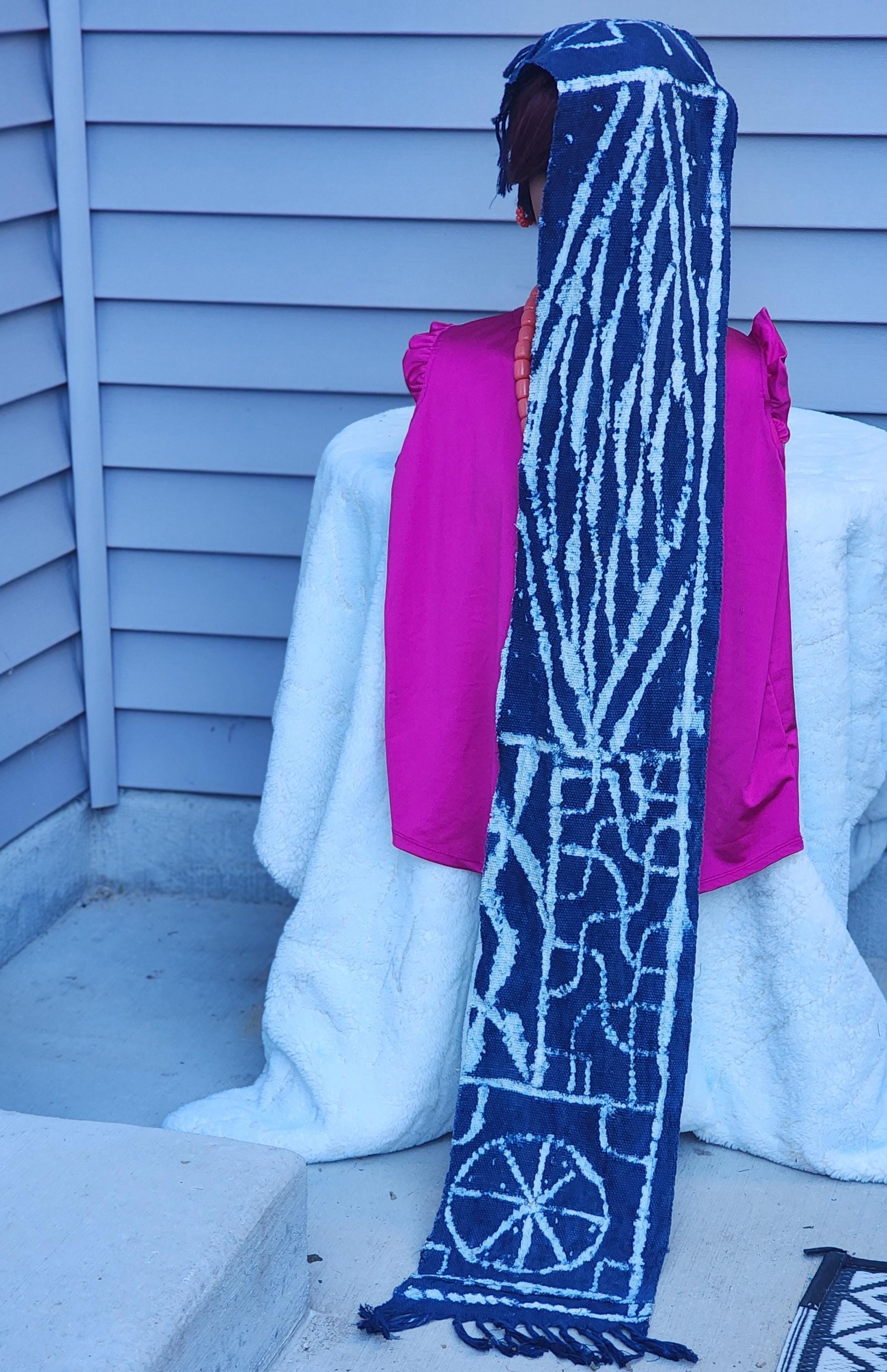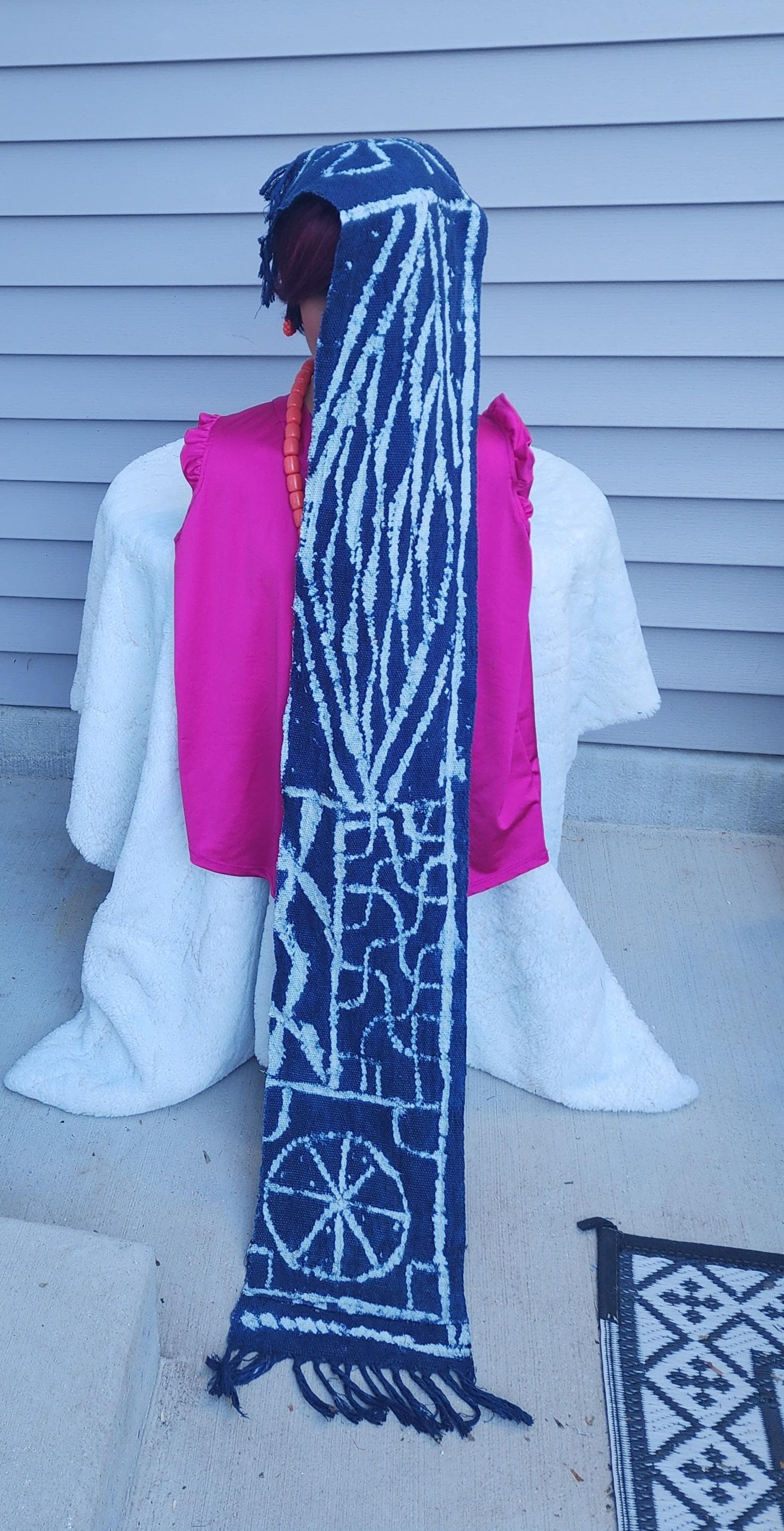 This is a scarf made of original handmade Ndop cloth / Ndop cloths originate from the Grassfields region of Cameroon and are mostly worn for very important ceremonies and rituals by the Bamileke tribes. The different symbols on the cloths, such as circles, lines and diamonds, represent the different beliefs of the peop