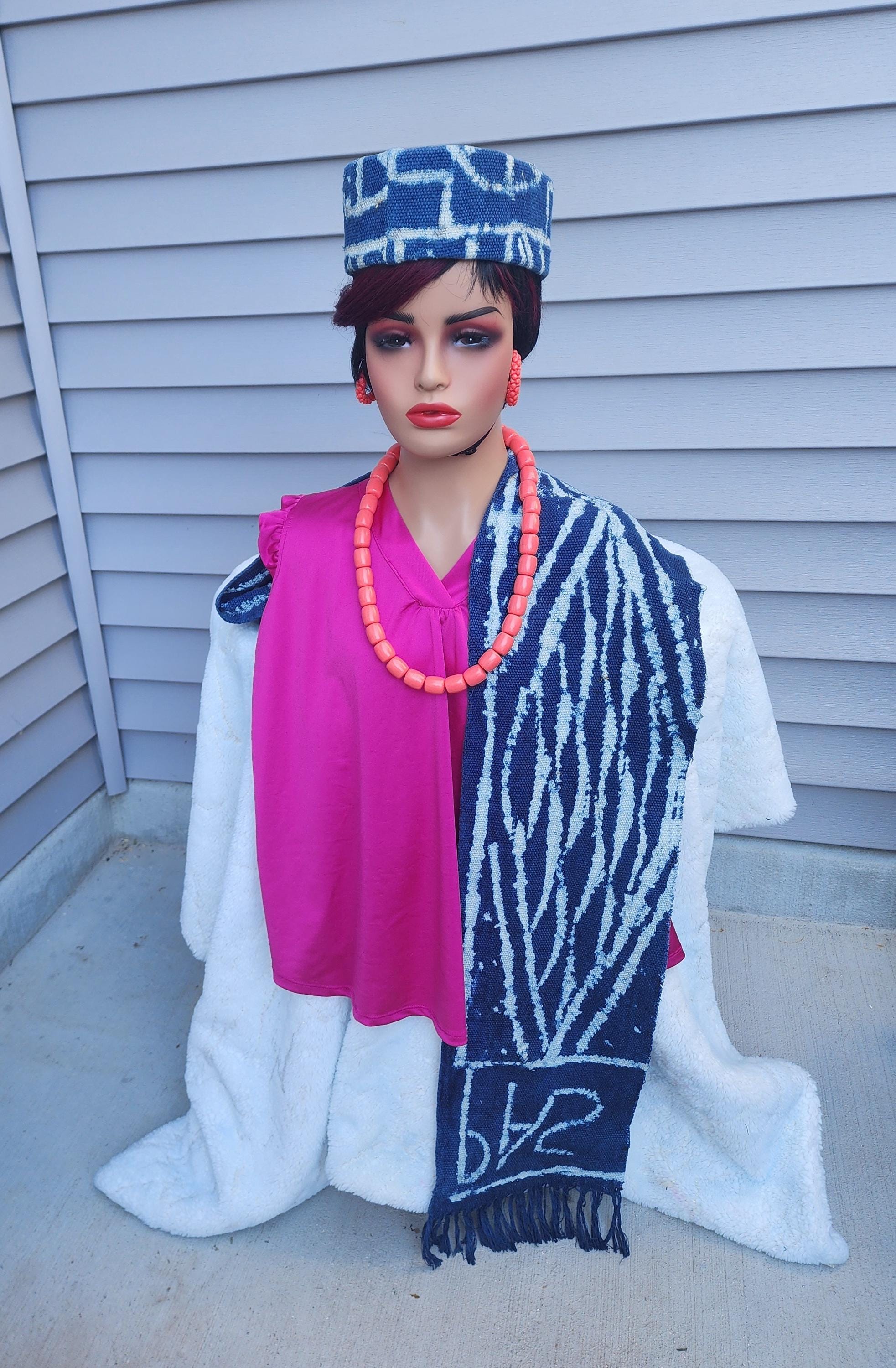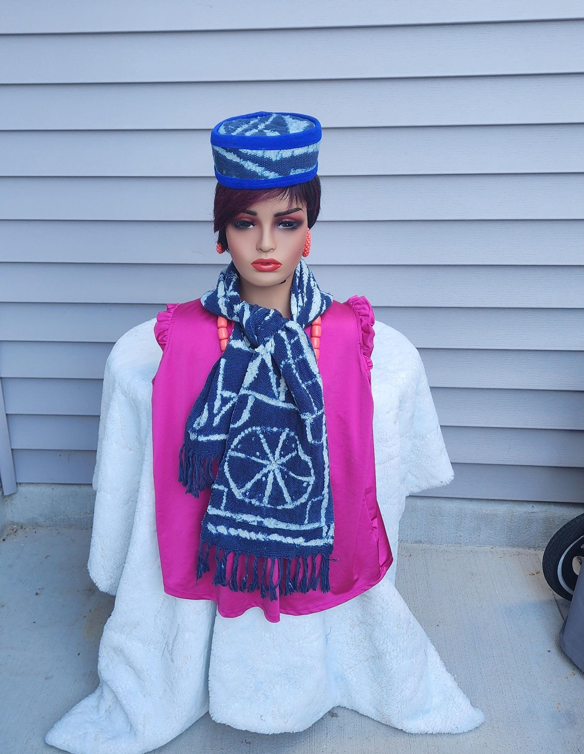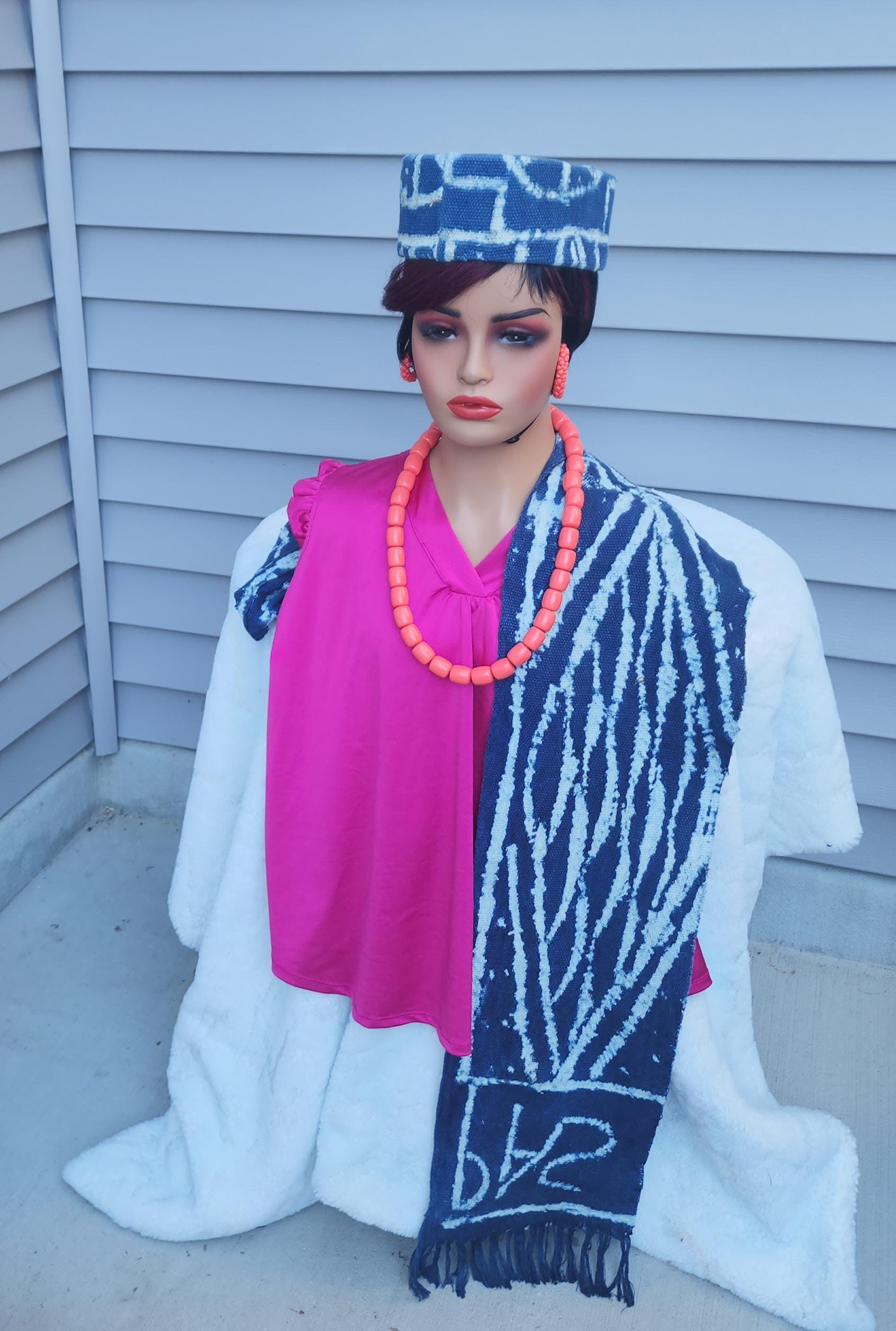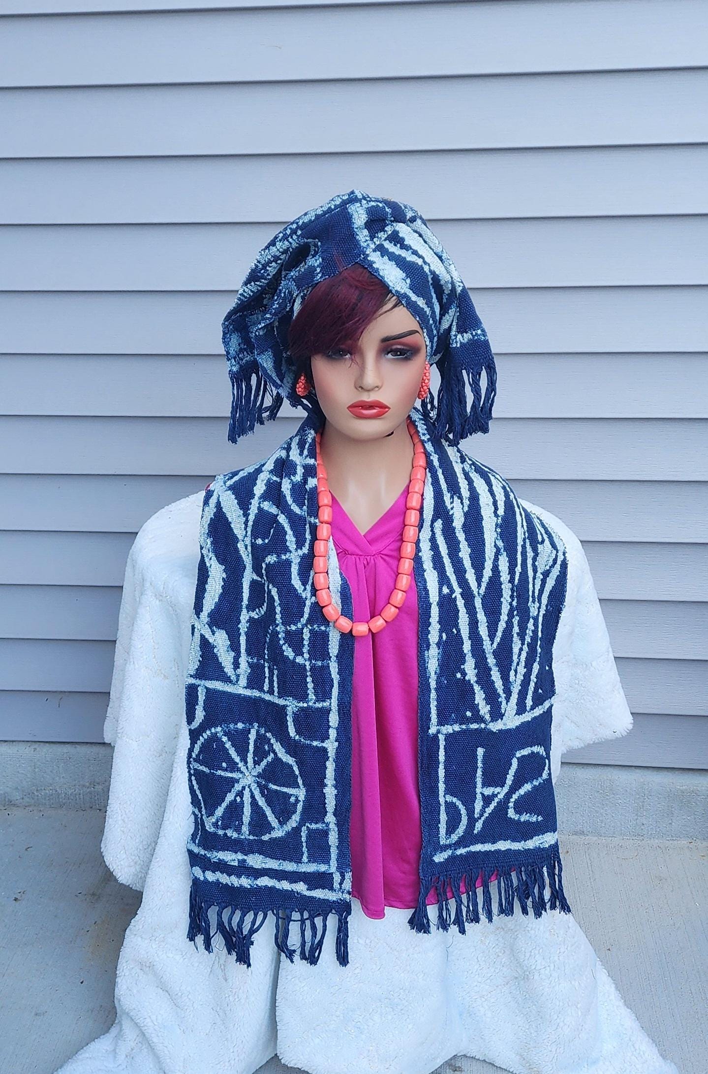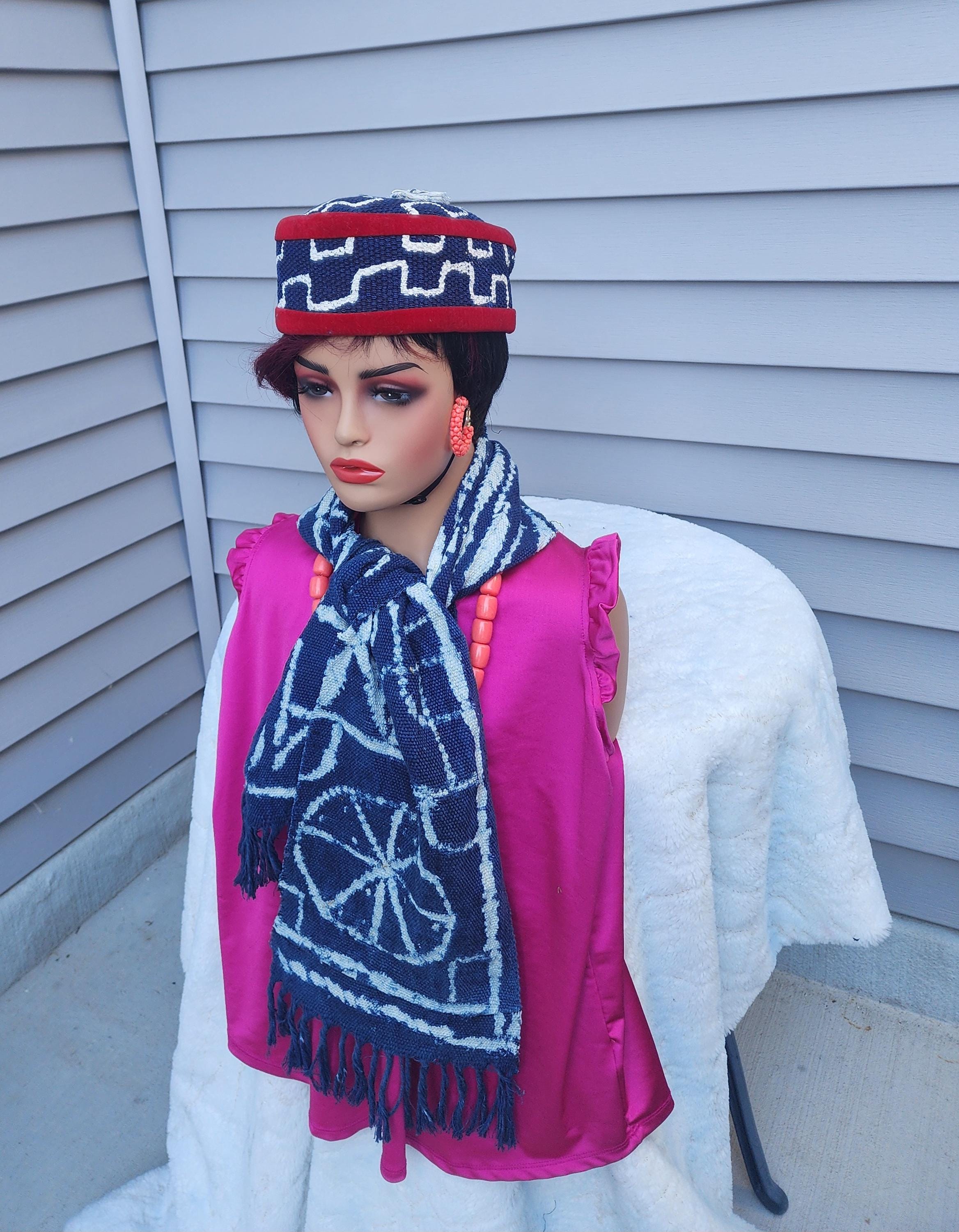 This is a scarf made of original handmade Ndop cloth / Ndop cloths originate from the Grassfields region of Cameroon and are mostly worn for very important ceremonies and rituals by the Bamileke tribes. The different symbols on the cloths, such as circles, lines and diamonds, represent the different beliefs of the peop